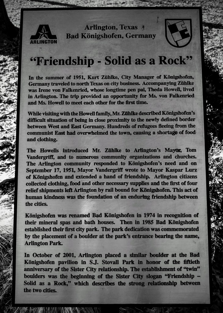 Buried near the monument is a time-capsule with documents and artifacts about the friendship. It will be opened in 2051 for the 100th anniversary. There is a large rock in Bad Königshofen’s Arlington-Park similar to ours at Stovall Park in Arlington.