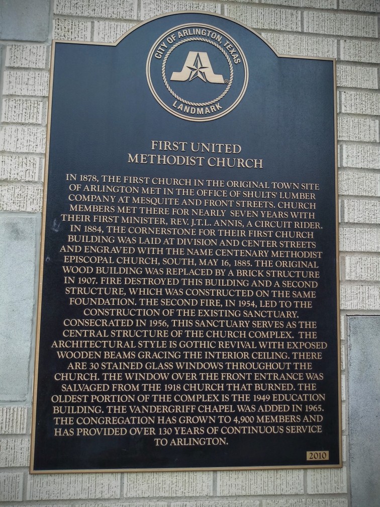 May is Historic Preservation Month! “Historical Marker Monday” is a new series on my blog highlighting historical markers. This week highlights the First United Methodist Church of Arlington at 313 N. Center Street.
