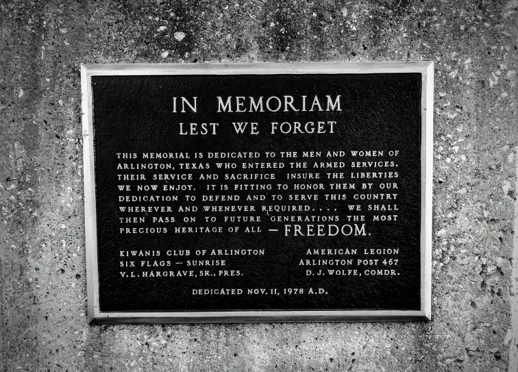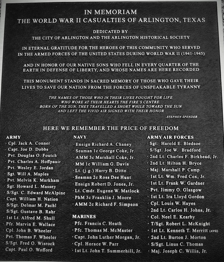 Also in the area are three other historical plaques. The first plaque pays tribute to heroes from Arlington who gave the ultimate sacrifice in World War II. The second plaque explains how the North Texas Agricultural College (1923-1949), now UTA, got involved with the wartime efforts and their impact. The third plaque, “In Memoriam – Lest We Forget,” pays tribute to the service and sacrifice of the men and women of Arlington who entered the Armed Forces.