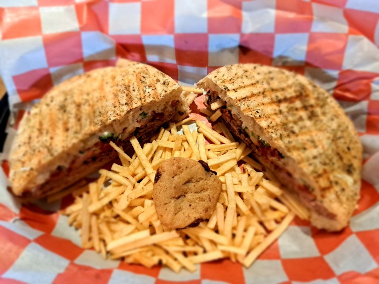 The deli has an old west theme with its menu and décor. I ordered the Doc Holiday, a roast beef panini with feta cheese, sun-dried tomatoes, chives, and mayo, served on focaccia bread. The paninis and sandwiches are served with potato sticks, and I also ordered a cup of coffee.