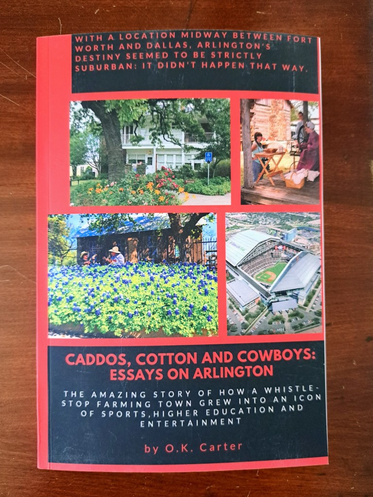 It took a while for the book to get finalized, but it’s now available on Amazon as a paperback and e-book. So, if you pick up a new copy of “Caddos, Cotton and Cowboys: Essays on Arlington” by O.K. Carter, you’ll see my name printed inside as the editor.