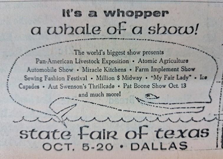 The newspaper ads show the buzz of small-town life—movies playing at the theater, a renewed high school football rivalry, car dealerships selling off inventory, deals at local stores, and the wonder, curiosity, and excitement of the upcoming State Fair. While Arlington is a large, mid-sized city of 400,000 people today, back in the 1950s, it was a small town just beginning to grow. Indeed, in 1950, Arlington’s population was about 7,692 people; by 1960, the population had exploded to 44,775 people.