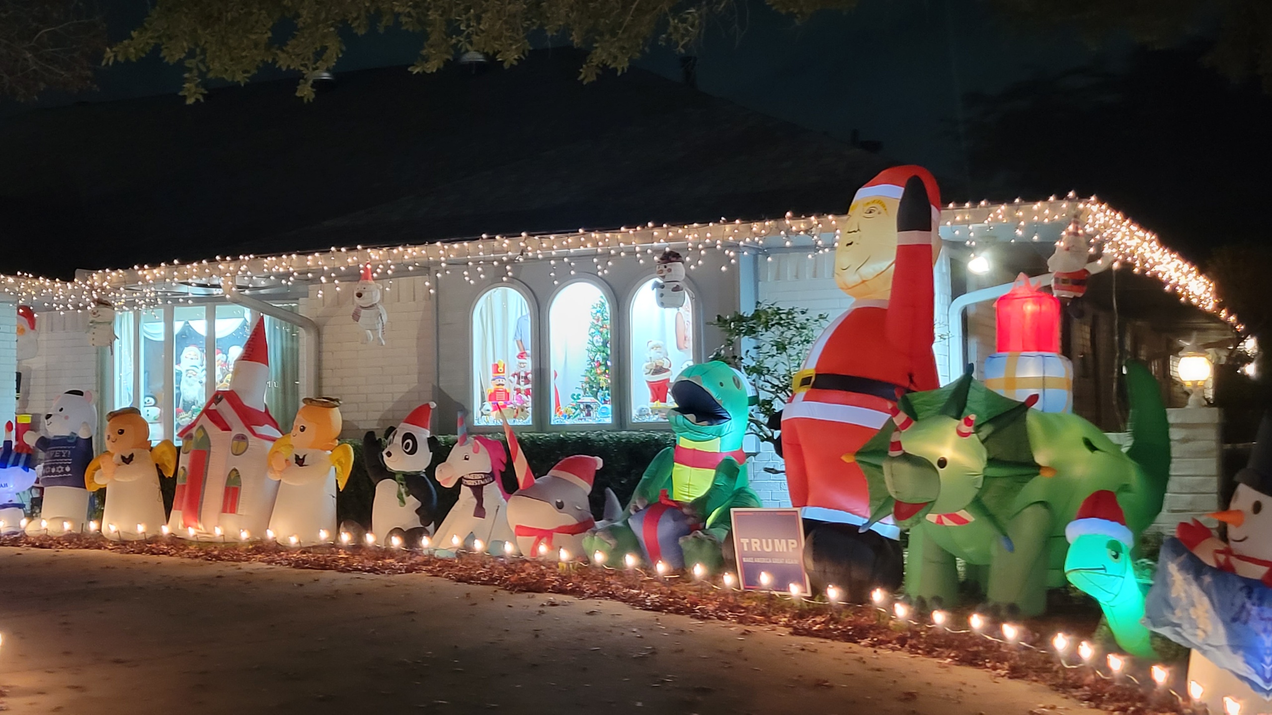 One house was apparently obsessed with pink flamingos, while moose surprisingly seemed popular this year. A few houses supported local college teams, while others showed love for their favorite characters or causes. Snoopy and his friends were popular, as were Disney characters. There was an interfaith house with a large Star of David paired with a cross. In contrast, another had a giant stuffed teddy bear that slowly moved—I can’t decide whether it was festive or frightening.