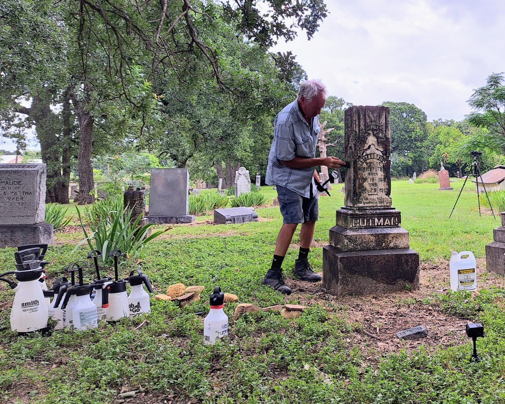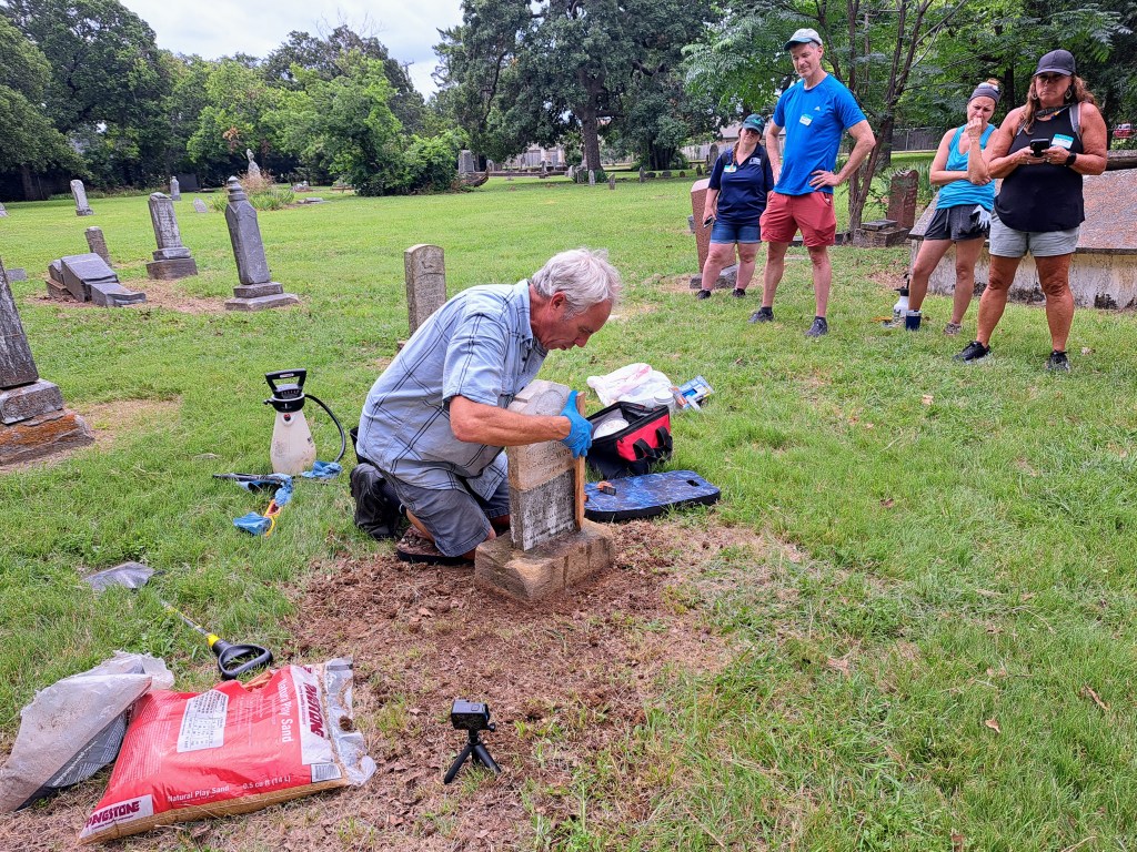 Jon Appell demonstrated how to clean a headstone — before and after, for comparison