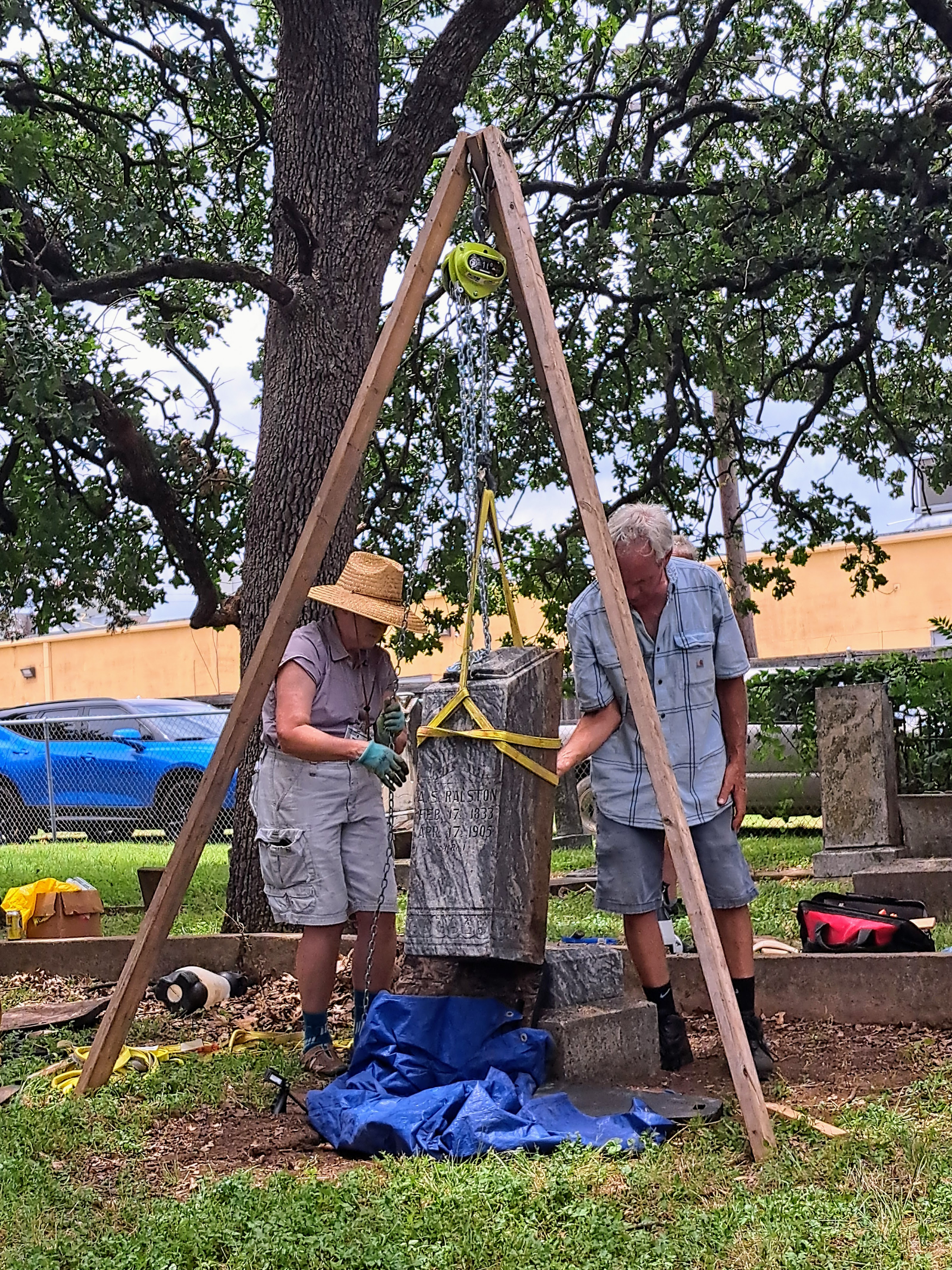 I only took a few notes for repairing stones, as it’s not something that I would likely attempt. But it was fascinating to watch. Repairing fractured tablets is the easiest way to get involved. You can do many repairs and re-settings without heavy equipment or immense strength. Jon demonstrated a few examples and made it look easy; attendees helped under his guidance. A homemade tripod hoist, sturdy pulley system, tarps, and nylon straps can often get the job done. Seek permission before starting on larger projects.