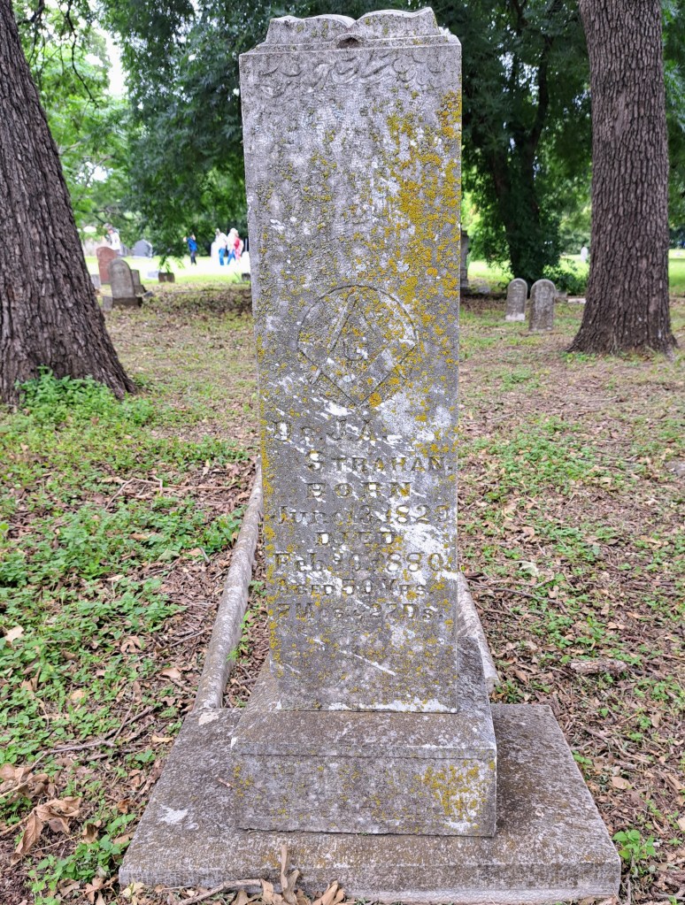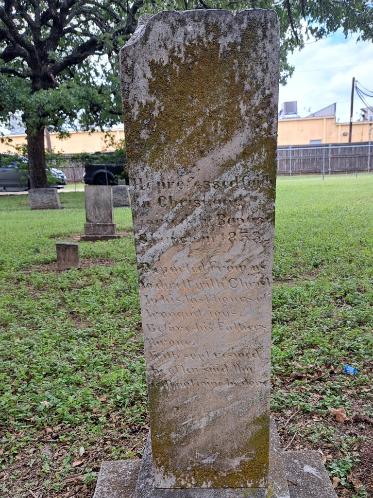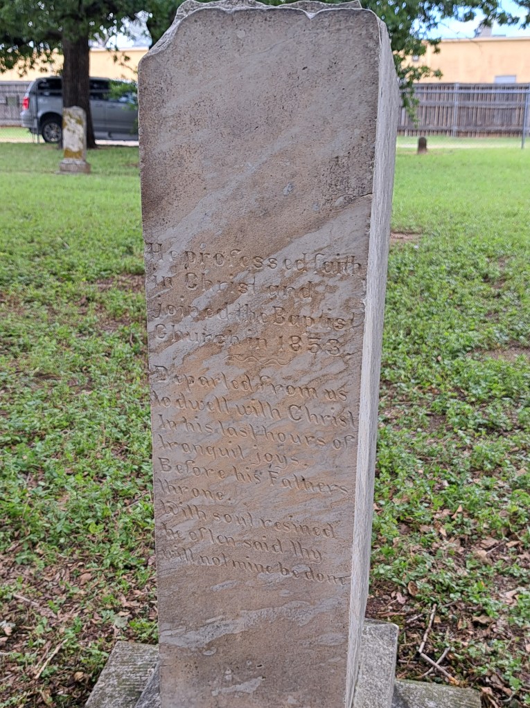 The event came to Johnson Station Cemetery in Arlington on June 19th. My wife and I attended the event, along with about 70 other people. It was one of the largest crowds on this year’s tour. While most people were local, and a few even had family buried there, some came from over 100 miles away. The Tarrant County Historical Commission and the Lucretia Council Cochran Chapter of NSDAR served as event organizers.