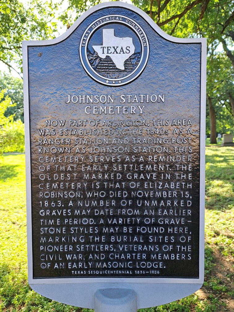 Johnson Station, now part of Arlington, was established in the 1840s as a ranger station and trading post. It was the first overnight stop for stagecoaches traveling between Dallas and Fort Worth. The cemetery’s oldest marked grave dates back to 1863, although some unmarked graves may be older. It’s one of the area’s earliest burial sites. Many pioneer settlers are buried there, including some Civil War Veterans. The cemetery is one of the last remnants of the Johnson Station community and an integral part of local history.