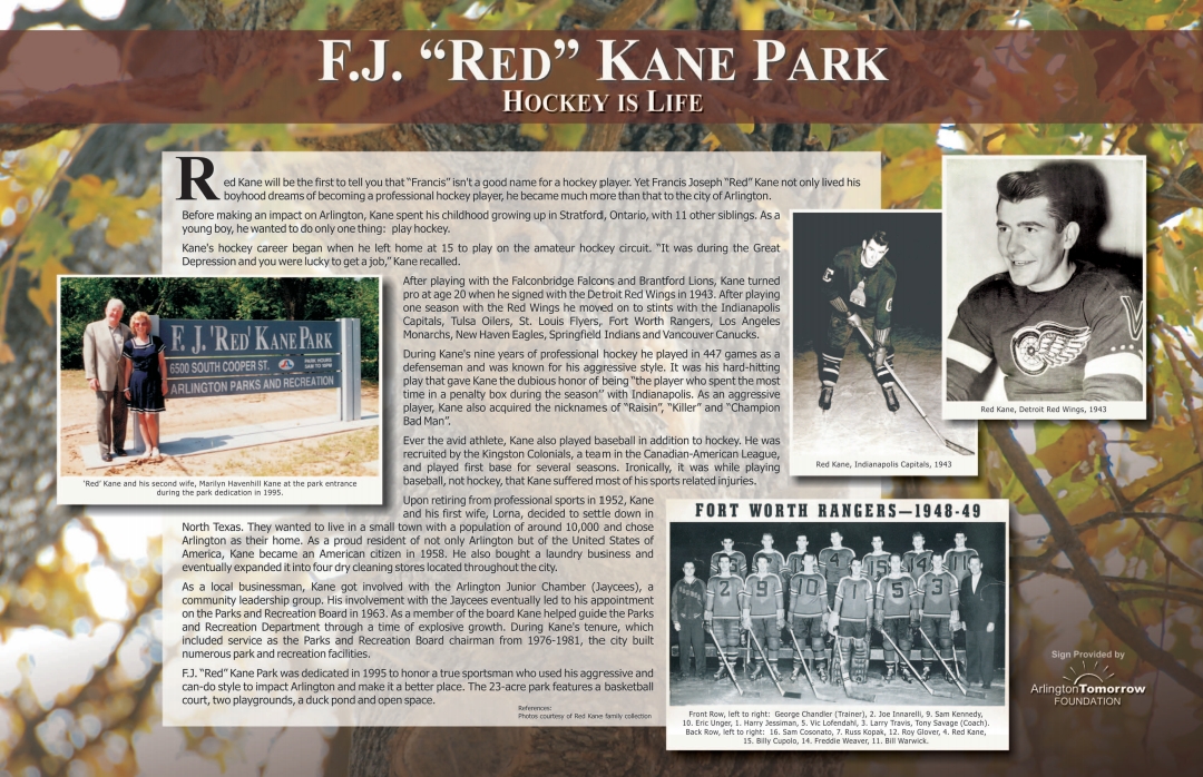 Kane was appointed to Arlington’s Parks and Recreation Board in 1963. He served for 18 years and was Chairman from 1976 to 1981. In 1995, F.J. “Red” Kane Park was dedicated in his honor. Amenities include a basketball court, a pond for fishing, a playground, a greenspace, and hiking trails that connect to the O. W. Fannin Natural Area. The park offers a quiet respite from the hustle and bustle of Cooper Street.