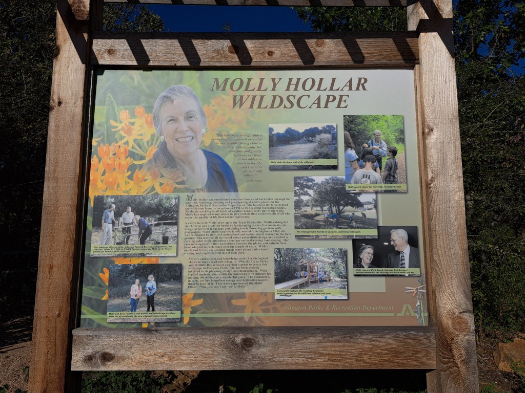 For me, the highlight at Arlington’s Veterans Park is the Molly Hollar Wildscape, created in 1994 by a grant from the Texas Parks and Wildlife Department. Molly Hollar (1928-2024) was a local nature conservationist who planned, designed, and maintained the wildscape bearing her name.