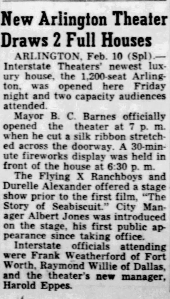 February 10, 1950 | Arlington Theater opened with a double screening of “The Story of Seabiscuit,” starring Shirley Temple. It was a Friday night, and much of the town came out to see the new, exciting theater. Arlington Mayor B.C. Barnes cut a ceremonial ribbon before the opening. There were also spotlights outside, fireworks, and live entertainment—this was an event!