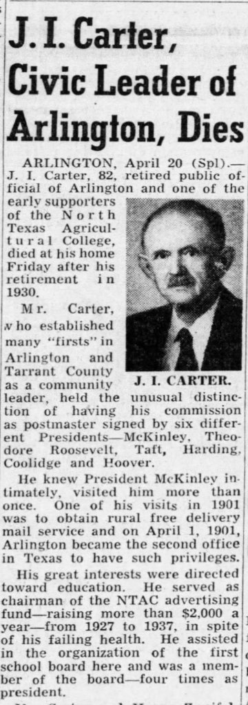 Carter began serving as Arlington’s postmaster in 1897; he was also elected to the positions of city secretary and city tax collector. A Mason for decades and a well-respected civic leader, he helped organize the first Good Roads Association in Tarrant County to improve the county’s highways.