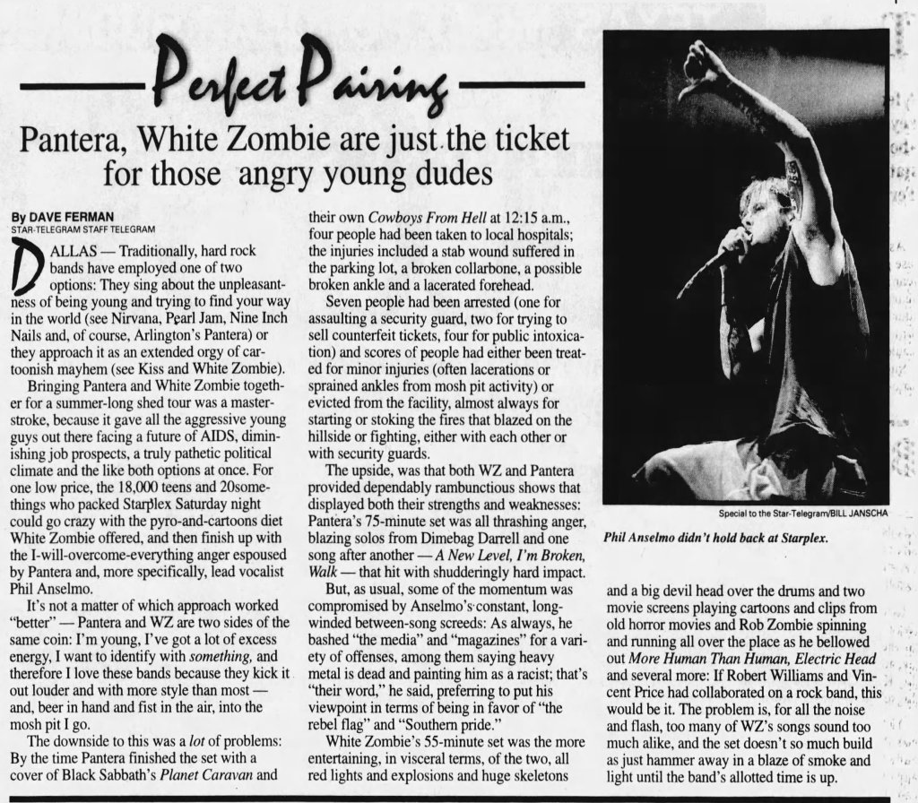 In this article from the Fort Worth Star-Telegram, music critic Dave Ferman offers a review of the Pantera and White Zombie concert at Coca-Cola Starplex in Dallas on July 13, 1996. Although not mentioned in this article, as it was likely kept discreet, Pantera vocalist Phil Anselmo overdosed on heroin after the concert, further driving a wedge into an already fractured band.