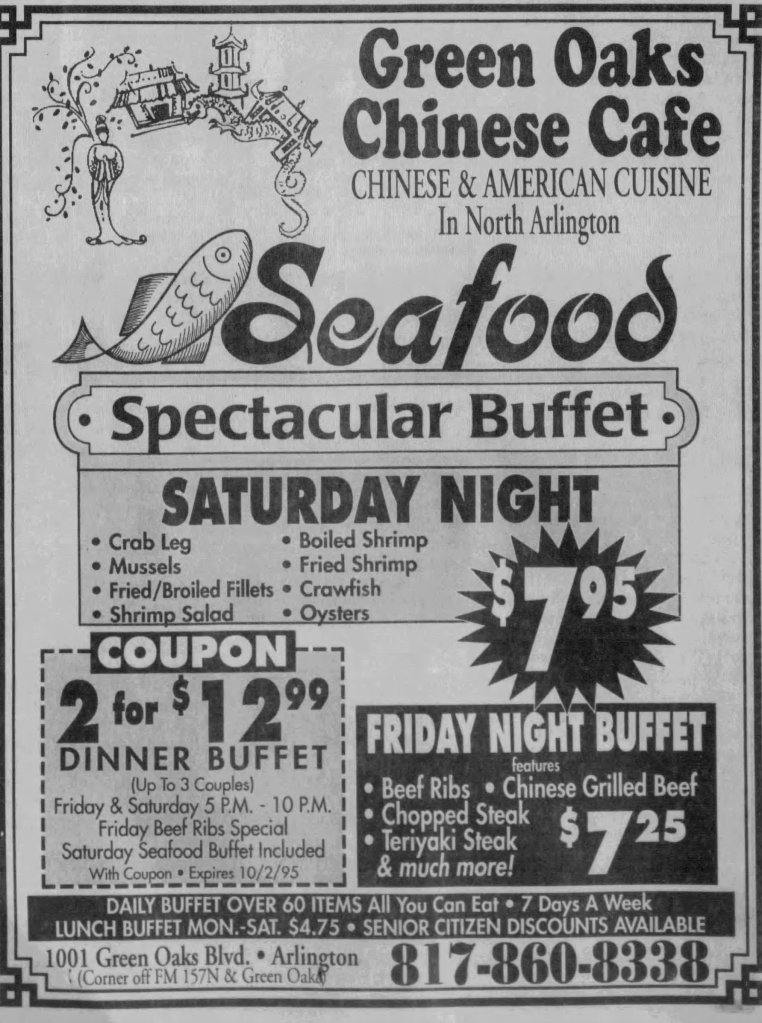 The closest proof I could find that this place even existed and I didn’t imagine the whole thing was this newspaper ad from 1995. It would have been from about the same time and location, but I still think it was called the Green Oaks Chinese Theater.