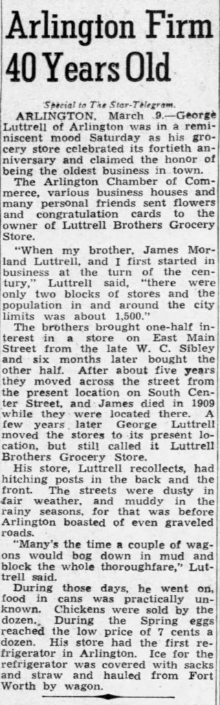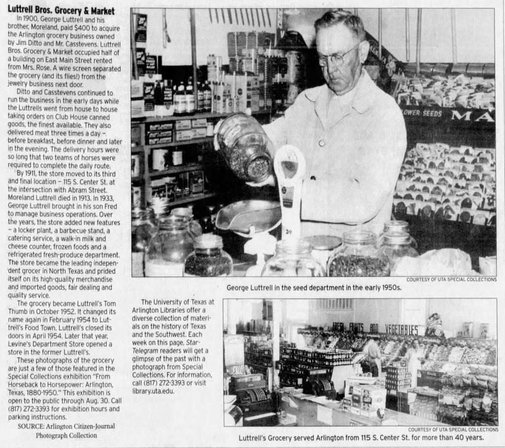 Luttrell Bros. Grocery & Market, also known as Luttrell’s Grocery, operated from 1900 to 1954 and was located at 115 S. Center Street for the majority of its run. The family-owned and operated business became one of the leading independent grocers in North Texas and a staple of Downtown Arlington.