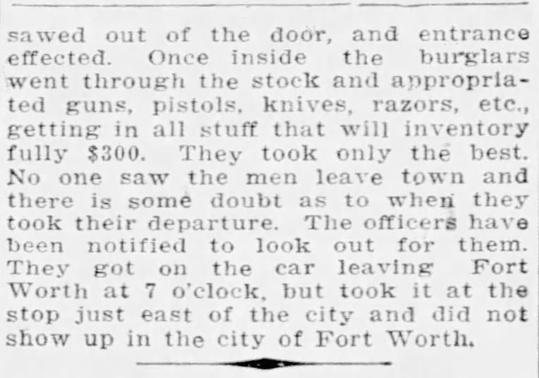 Burglars hit J. S. McKinley’s store, helping themselves to $300 worth (nearly $11K today) of guns, pistols, knives, and razors before making off like thieves in the night. It’s unknown if the suspects were ever identified.