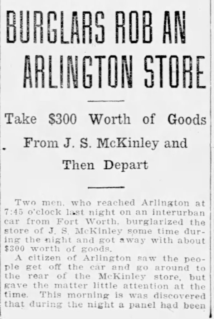 With Arlington’s location between Dallas and Fort Worth, Interurban cars and the railroad brought many people to and through the town. The burglars used Arlington’s location, the ease and anonymity of public transportation, and the cover of darkness to remain undetected.