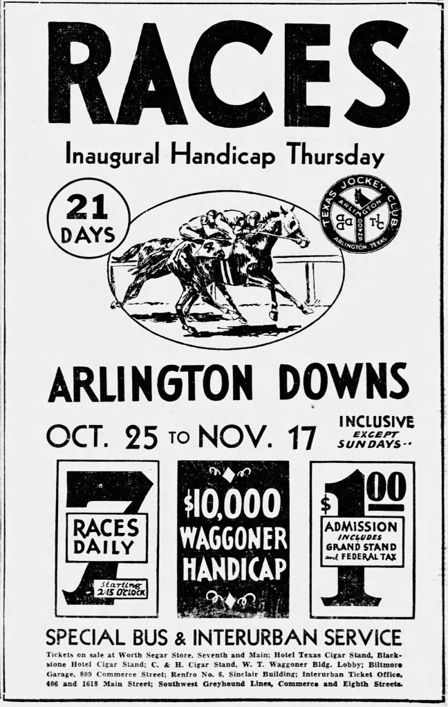 This ad from the Fort Worth Star-Telegram promoted the upcoming races at Arlington Downs, held October 25 to November 17, 1934.