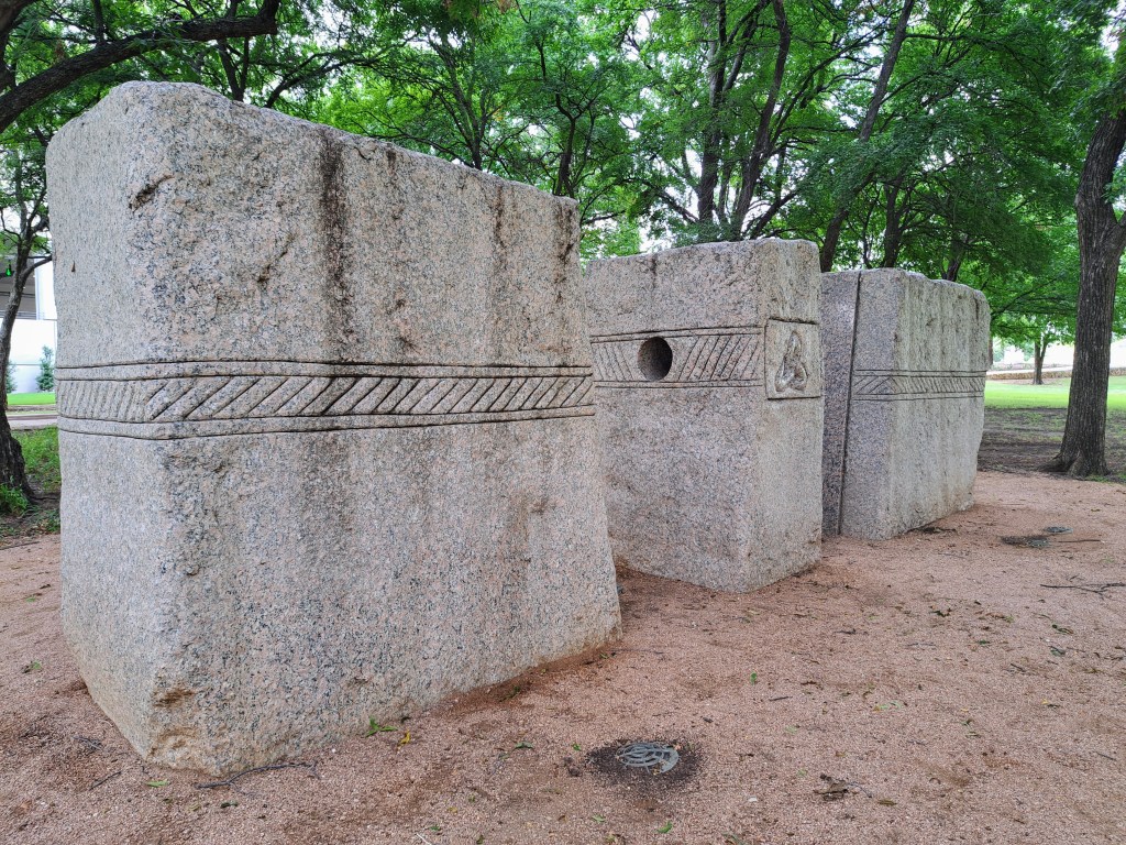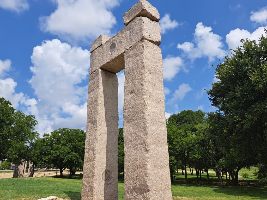When the land was sold for redevelopment to make way for the ‘Arlington Highlands’ shopping center, which later opened in 2007, the artwork was donated to the city and moved to a water treatment plant for storage, where it remained dormant for over a decade. (Because what does one do with an unexpected gift of five megaliths?) Finally, the artwork was resurrected and rededicated on October 22, 2009, in its current location at Richard Greene Linear Park near the stadiums. Hines oversaw the recreation of the sculpture in its new location.