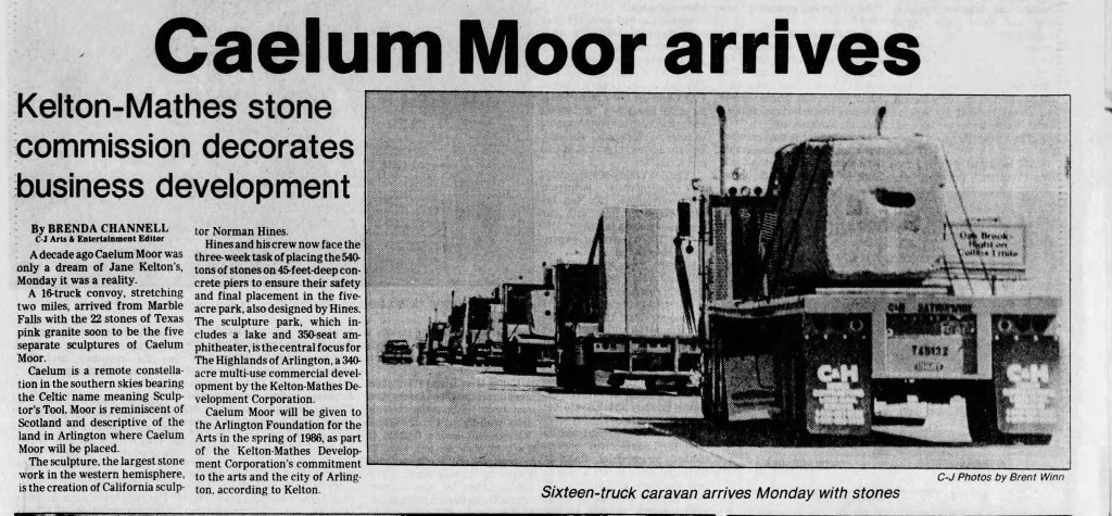 From 1986 to 1997, the environmental sculptures were located off I-20 and Matlock in South Arlington at the ‘Highlands in Arlington,’ a mixed-use business park with office and retail space. It was also the site of the Scottish Highland Games, a festival with culture, competition, and entertainment.