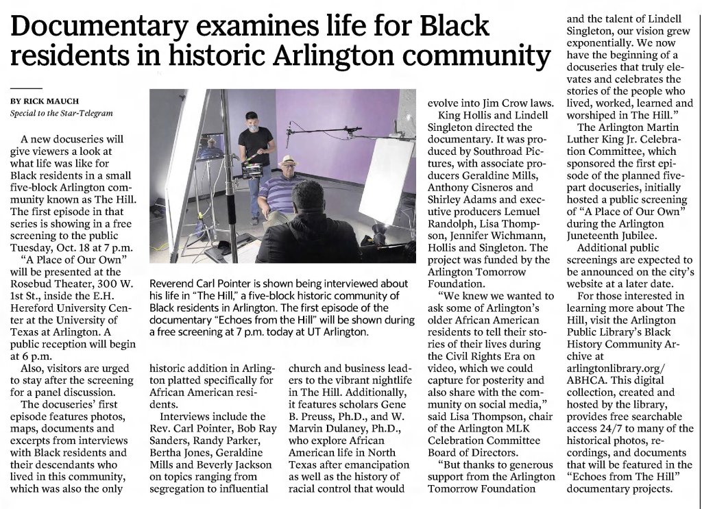 This article shares info about “Echoes From The Hill,” a documentary exploring Black history in Arlington that premiered in June 2022.