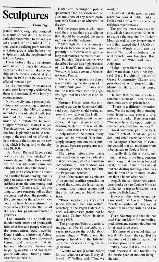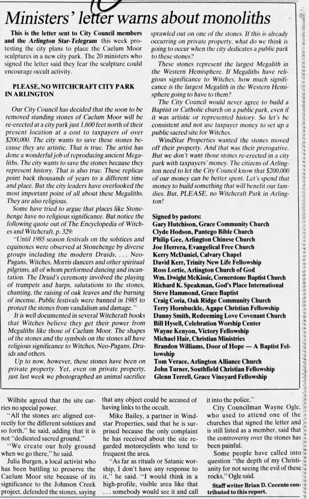 Sculptor Norm Hines said these claims were ‘ridiculous,’ however, at least one group admitted to using the site for such purposes and said they would continue to do so if the sculptures were moved to a public park. Truthful or not, 20 local religious leaders felt strongly enough about the issue to sign a letter titled “Please, no witchcraft city park in Arlington,” that they submitted to the City Council and Arlington Star-Telegram newspaper in 1996.