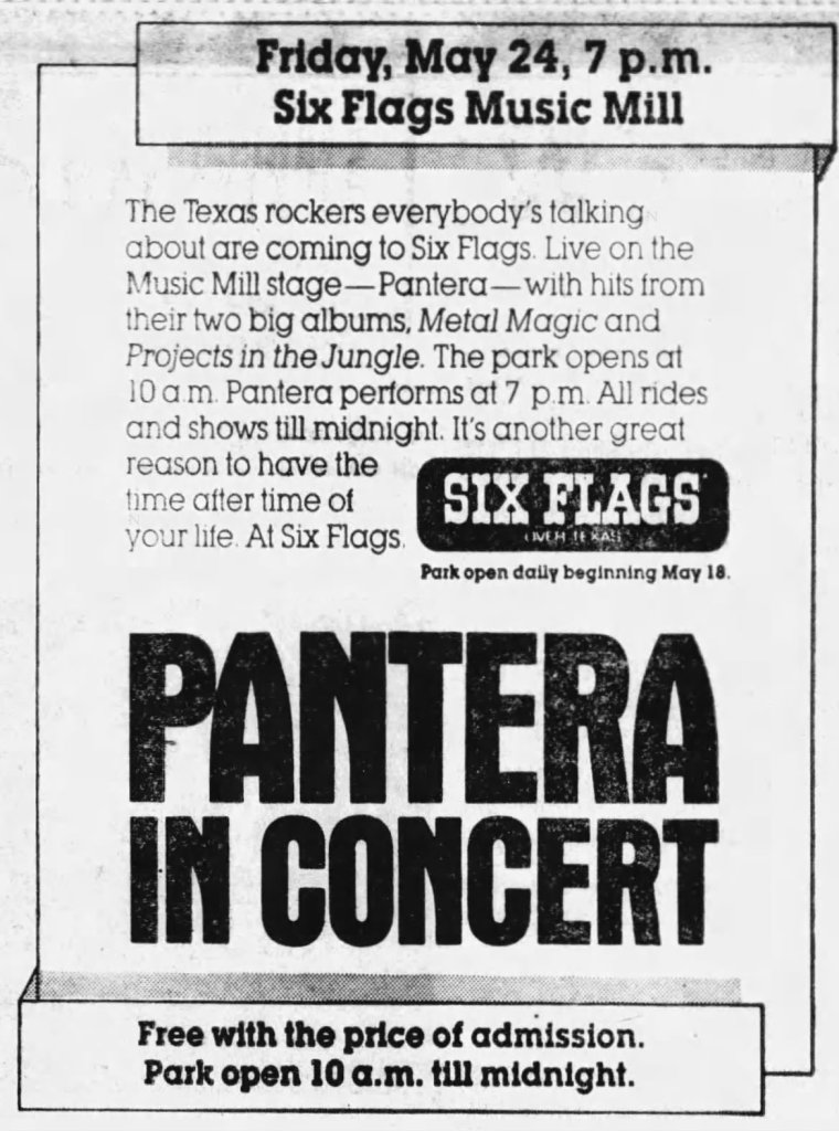 In May 1985, Pantera played ‘Friday Night at the Flags,’ a concert series at the Music Mill Amphitheater inside Six Flags Over Texas. It was one of their largest shows to date, marking a significant step up from the previous summer’s show at the Southern Palace—a smaller, indoor Six Flags venue that had proved too small for their rapidly growing fanbase.