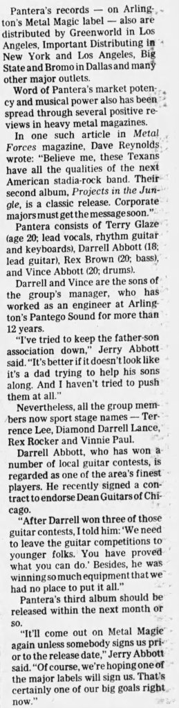 These articles and newspaper clippings from April-May 1985 detail Pantera’s rise in popularity, including an upcoming concert at the Six Flags Music Mill Amphitheater.