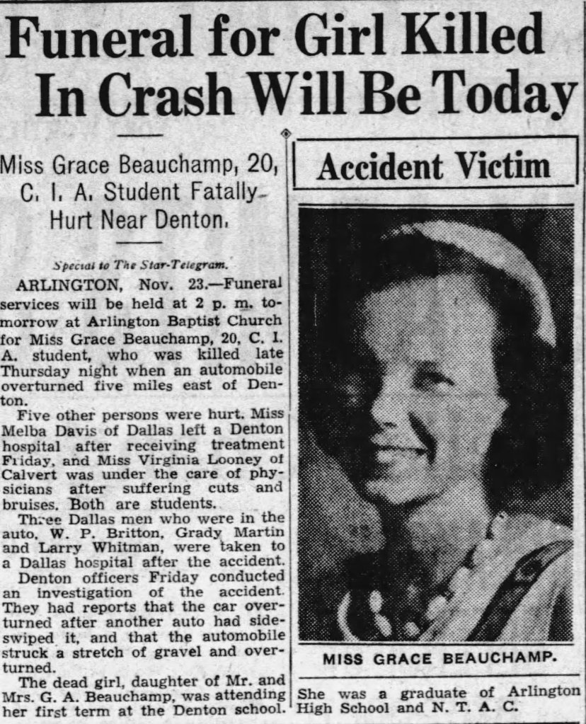 On the night of November 22, 1934, Grace and five other youths were traveling near Denton when their car was sideswiped, causing it to overturn in the darkness. While the others suffered minor injuries, Grace passed away.