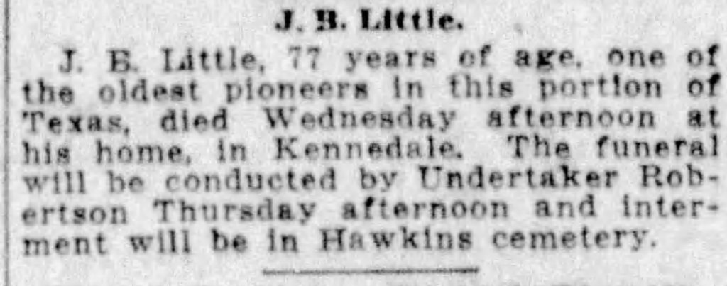 The Littles, the Hawkins, and other families traveled from Tennessee, arriving in East Texas in the early 1840s. Many from the same caravan later traveled to what would become Tarrant County.