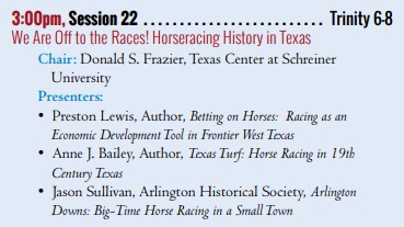 We Are Off to the Races! Horse Racing History in Texas — From frontier towns to Depression-era racetracks, this session explores the evolution of horse racing in Texas. Presenters trace how the sport reflected broader cultural and economic shifts—from informal quarter races of the nineteenth century to the rise and fall of Arlington Downs in the early twentieth century.