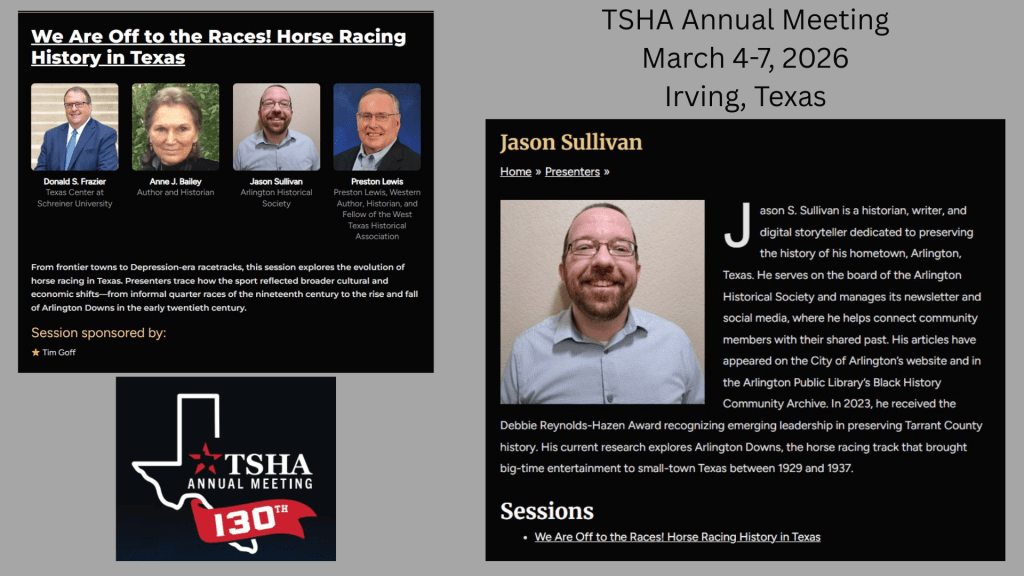 I was honored to be invited to speak at the Texas State Historical Association’s (TSHA) Annual Meeting yesterday. I participated in the session “We Are Off to the Races! Horse Racing History in Texas,” where I presented on Arlington Downs, one of my favorite local history topics. Operating as a horse racing track from 1929 to 1937, Arlington Downs was a premiere venue widely considered one of the best in the country, rivaling famous ones in New York and Kentucky.