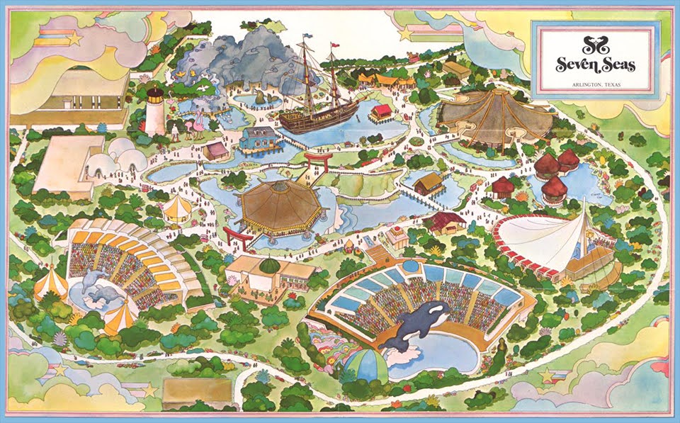On March 18, 1972, Seven Seas officially opened its gates in Arlington. Located “off the Turnpike,” the park sat between Six Flags Over Texas and Arlington Stadium—the initial home of the Texas Rangers, who were also preparing to begin their debut season in the city.