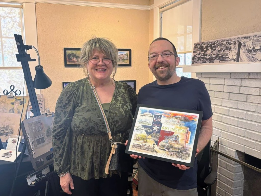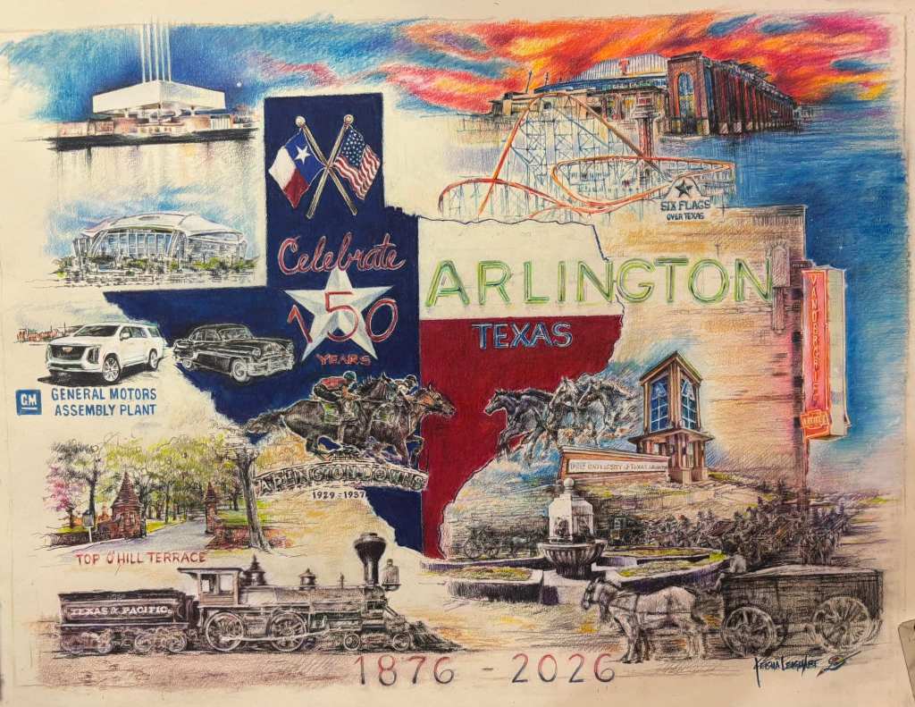 Keisha did an outstanding job on this one. What I like most about it—besides how cool it looks and the chance to support a local artist—is that it incorporates so much of Arlington’s history through subjects that genuinely interest me. Top O’ Hill Terrace and Arlington Downs were the two things that first sparked my passion for local history, and everything else referenced is something I’ve researched or read about in great detail. While Arlington doesn’t have a traditional skyline, these landmarks represent the heart of our city and its rich heritage.