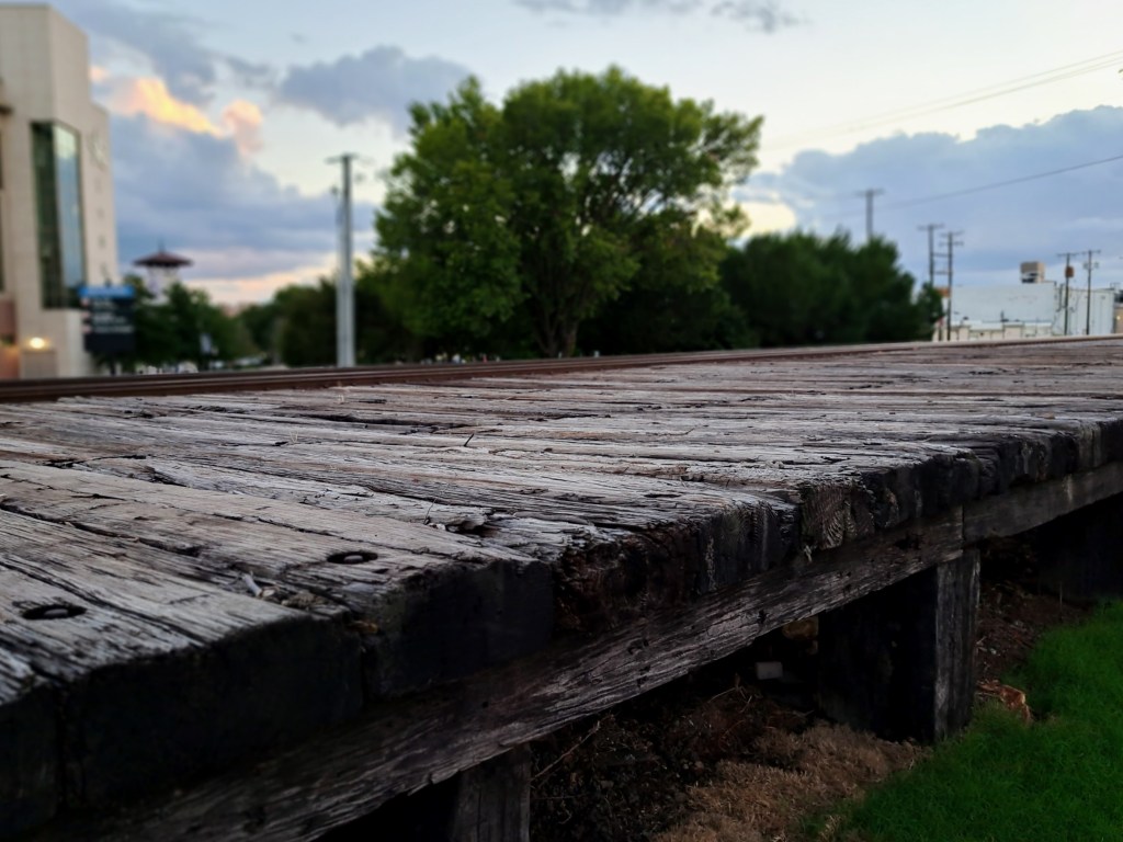 Head back toward Center Street, passing Gene Allen Park and its tribute to our Sister City, Bad Königshofen. Follow the path as it curves around the library and cross the railroad tracks. Look for the wooden train platform on the left, near the parking lot. This is my favorite part of the tour because of the sense of history it evokes.