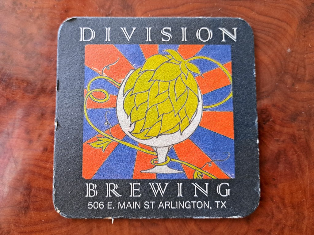 I acquired this bad boy from Dr. Jeckyll’s Beer Lab in Pantego. It was a busy Sunday afternoon; as I approached the counter to order, the crowd surreptitiously guided me toward the edge of the bar. It was fate. While waiting for my pint, I noticed a large box of coasters and various ephemera sitting next to me. I quickly spotted a coaster for Division Brewing and plucked it from the box.