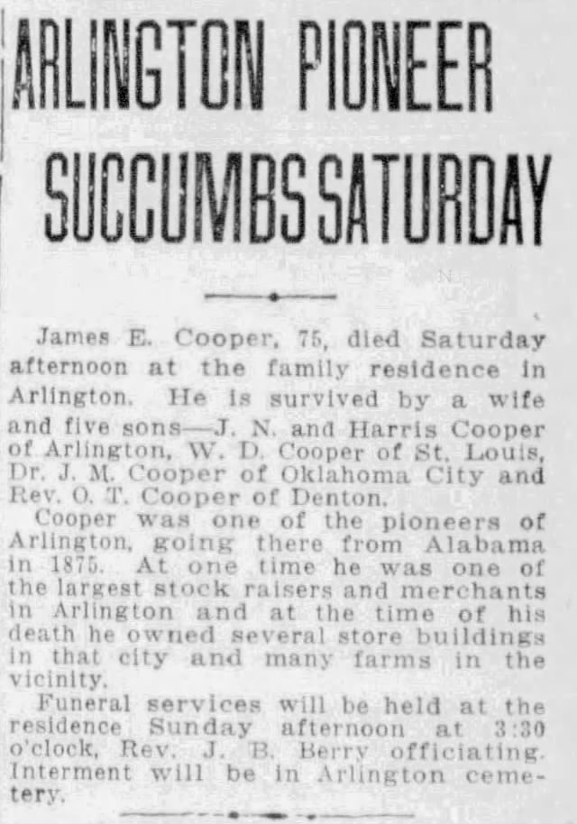 As the namesake of Cooper Street—a road that began as a simple shortcut through his pasture—James D. Cooper and his family were among the early pioneers who helped shape modern-day Arlington.