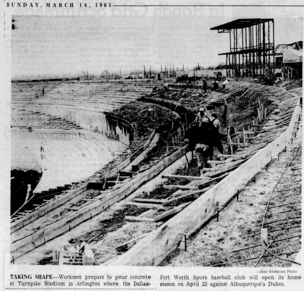 On April 23, 1965, the first baseball game was played at Turnpike Stadium in Arlington. The Dallas–Fort Worth Spurs of the Texas League defeated the Albuquerque Dodgers by a score of 4–0. Official attendance was 7,231 fans. That number may sound low, but it was over 70% occupancy and respectable for a new minor league team playing in a new stadium—especially one that wasn’t even totally finished on opening day.