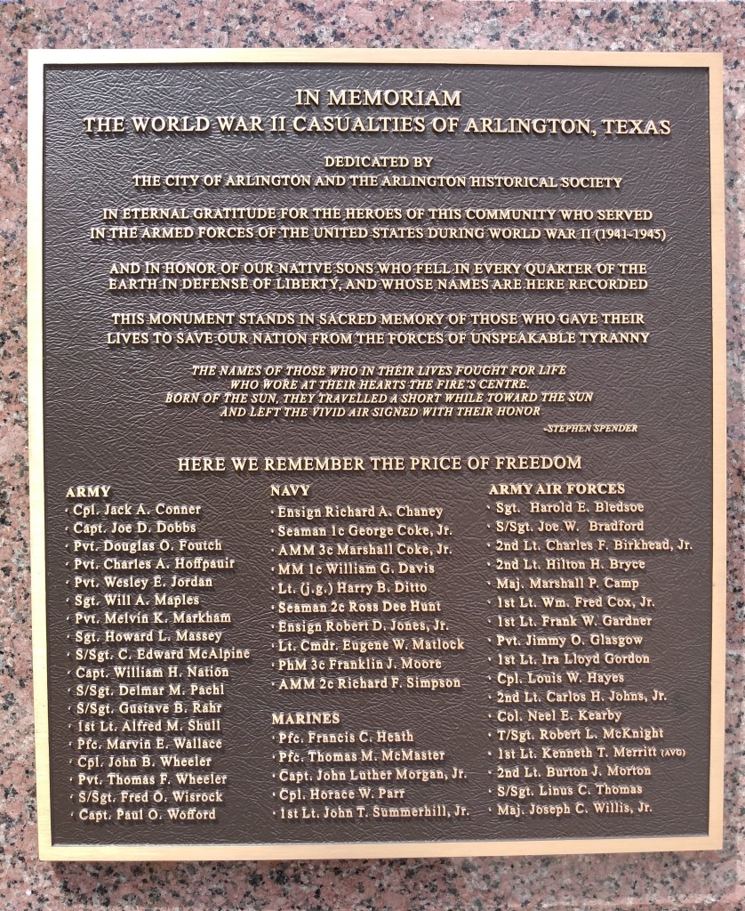 - Location: Plaque is part of Arlington’s World War II Memorial, located at 101 W Abram Street (between City Hall and the George W. Hawkes Downtown Library.)