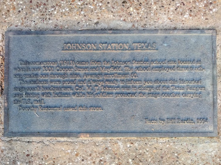 - Markers: Johnson Station, Texas (plaque) and Johnson Station School (cornerstone)
