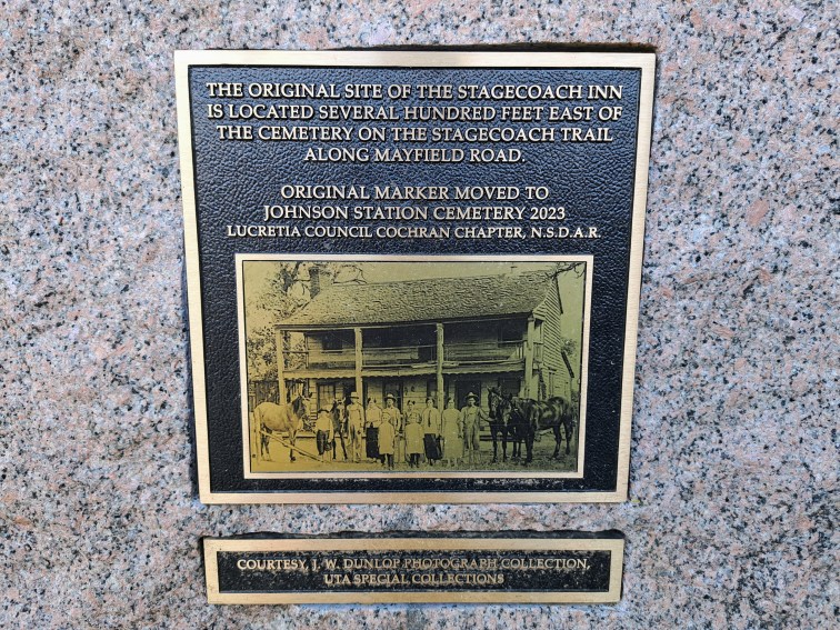 The original site of the Stagecoach Inn is located several hundred feet east of the cemetery on the Stagecoach Trail along Mayfield Road.