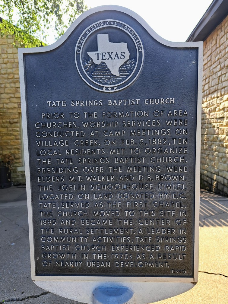 Prior to the formation of area churches, worship services were conducted at camp meetings on Village Creek. On Feb. 5, 1882, ten local residents met to organize the Tate Springs Baptist Church. Presiding over the meeting were elders M.T. Walker and D.B. Brown. The Joplin Schoolhouse (1 mi. E), located on land donated by E.C. Tate, served as the first chapel. The church moved to this site in 1895 and became the center of the rural settlement. A leader in community activities, Tate Springs Baptist Church experienced rapid growth in the 1970s as a result of nearby urban development. (1981)